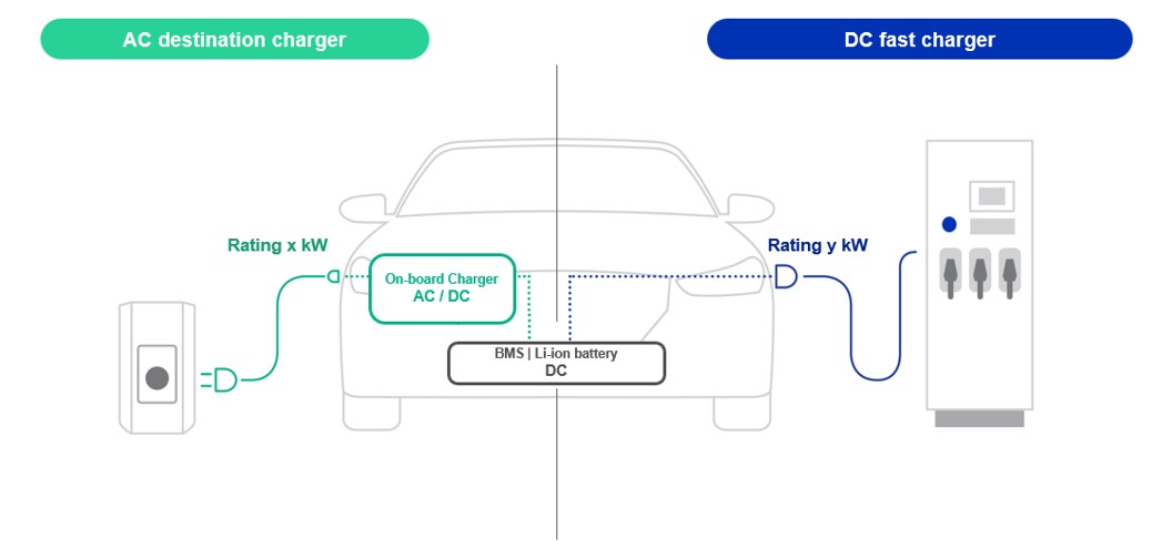 AC charging is often referred to as low-speed charging, using cost-effective hardware. In contrast, DC charging enables fast charging because the power of the car’s OBC is no longer a limitation, requiring more expensive equipment (offboard DC fast charger).