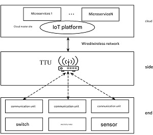 The overall architecture of the power distribution Internet of Things is shown in Figure 1. It is divided into three layers. The upper layer is the cloud, the cloud-based main station; the next layer is the edge, that is, edge computing, which extends cloud computing to the edge; the last layer is the terminal, various types of smart terminals, which realize the perception of the distribution network and build a cloud-edge-terminal power distribution Internet of Things architecture as a whole [9]. The essence of the power distribution Internet of Things is to deeply integrate informatization and industrialization, and further release the productivity of the original distribution network through the power of informatization, achieving a qualitative leap.