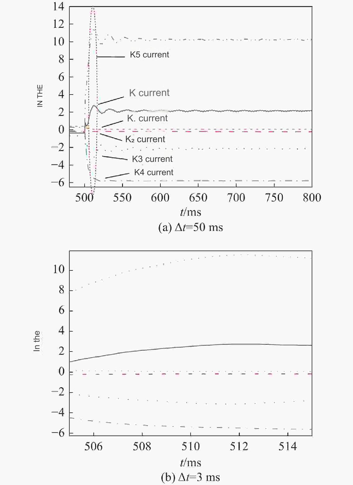 When a busbar fault occurs, K1 reaches the setting value of stage II protection 5.9 ms after the fault occurs and disconnects 35.9 ms after the fault occurs. Since the current flowing through K2 will rise in a short time, stage I protection will be triggered. As the current drops rapidly, the protection returns, and K2 is disconnected by stage III protection 102.7 ms after the fault occurs. K3 reaches the setting value of stage II protection 3.2 ms after the fault occurs and disconnects 33.2 ms after the fault. As the current rises in a short time at the initial moment of the fault, K4 triggers stage I protection, and then the protection returns and disconnects 31 ms after the fault. K5 , K6 , and K7 do not operate.