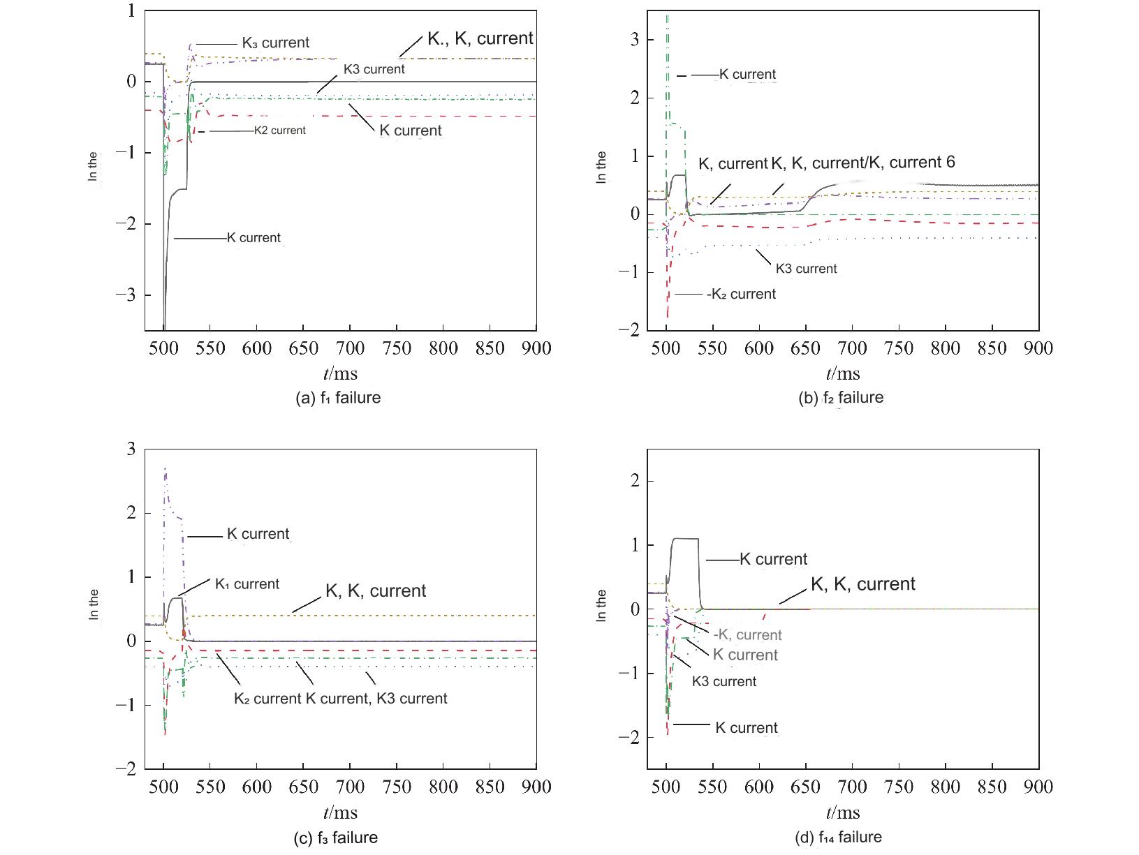 Taking typical branch faults as an example, this paper simulates and verifies the AC access branch fault f1 , energy storage branch fault f2 , charging pile branch fault f3 and bus fault f4 in Figure 5 , and sets the fault occurrence time to 500 ms. Figure 7 shows the changes in branch currents under different faults.