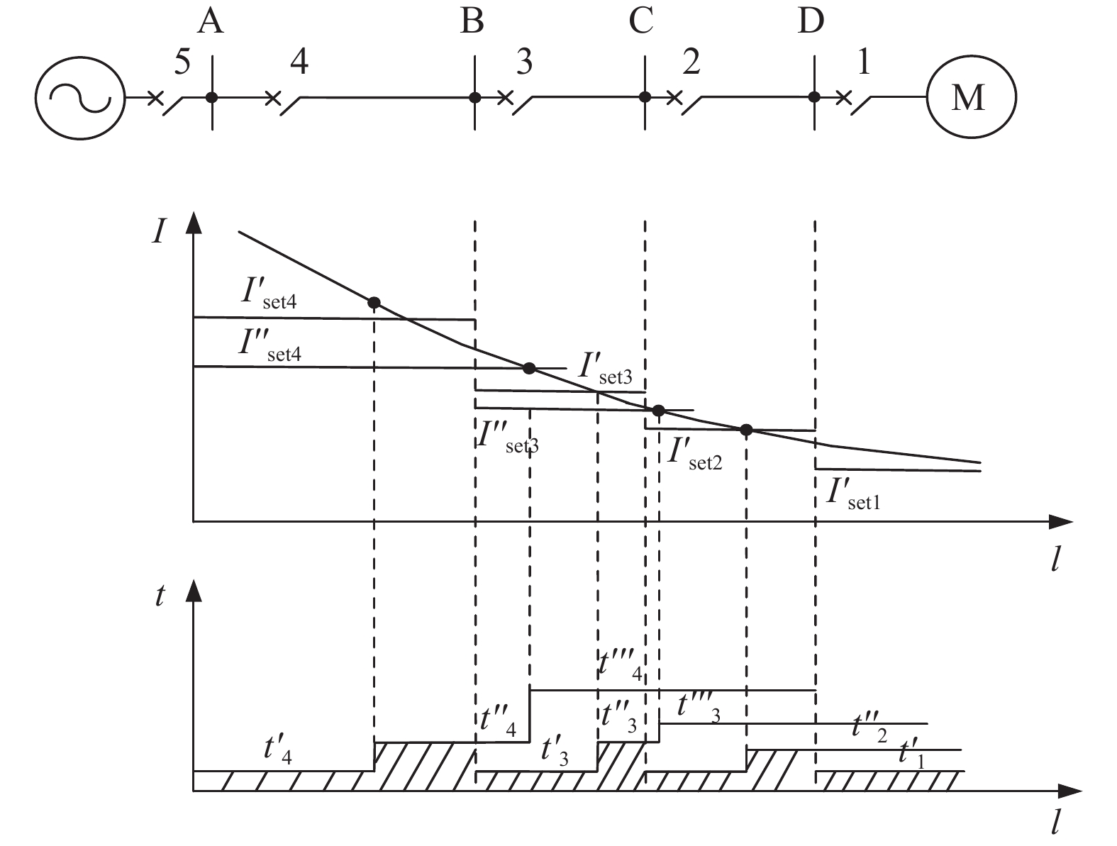 The coordination and actual action time of typical stage current protection are shown in Figure 1. For the load at the end of the power grid, protection 1 generally adopts instantaneous quick-break protection to meet the protection requirements. Its setting value is set according to the load current under the maximum operation mode. Other protections in the power grid need to cooperate with protection 1 in terms of setting value and time limit. Time-limited current quick-break protection can be added . The closer to the power supply end, the greater the overcurrent amplitude and the longer the action time limit of the overcurrent protection. Therefore, the protection close to the power supply end generally needs to be equipped with three-stage protection.