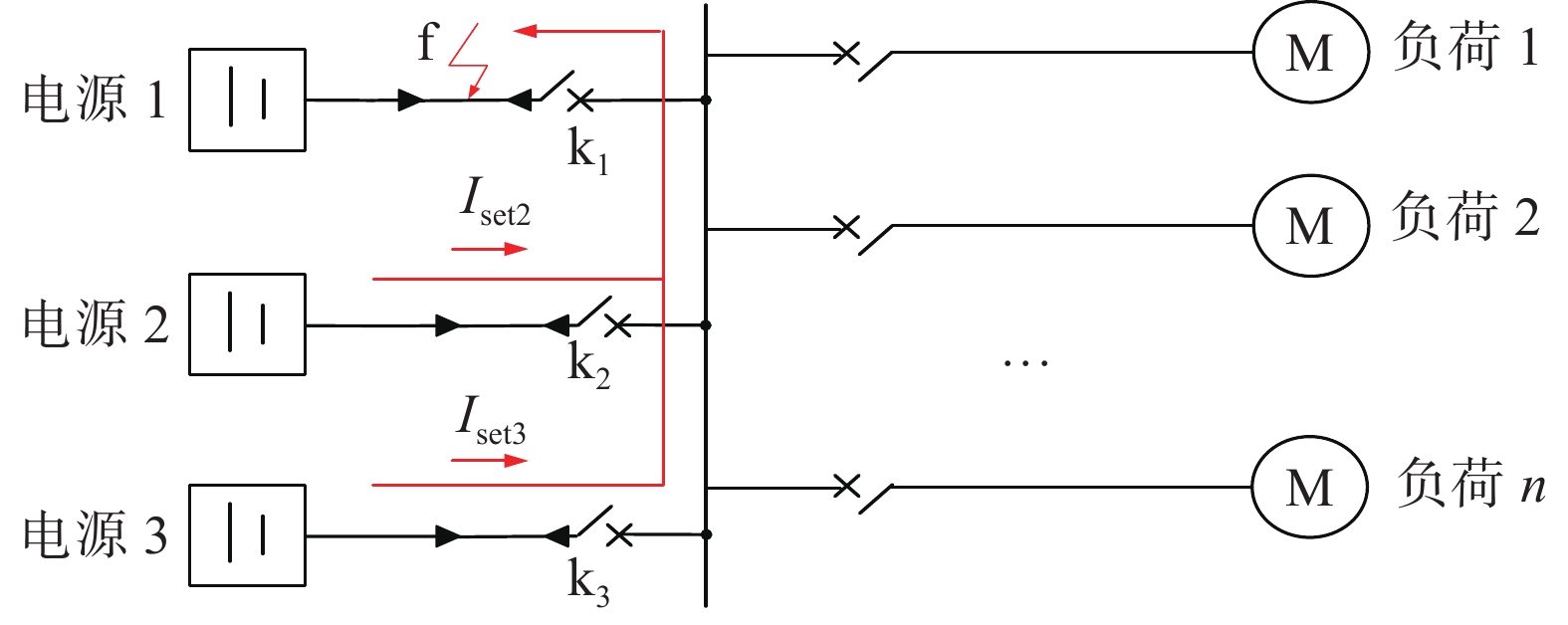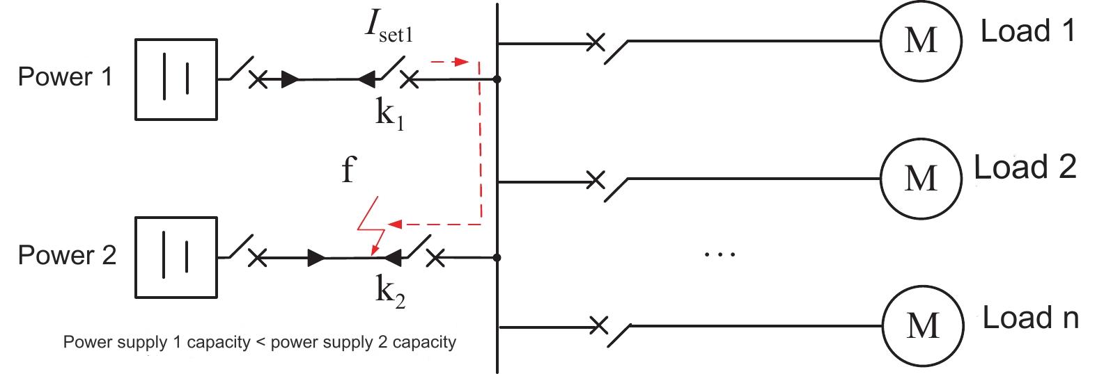 When there are only two voltage sources in the DC microgrid, as shown in Figure 4. If the capacity of power source 2 is greater than that of power source 1, when a short circuit occurs in the branch of power source 2, the current flowing through circuit breaker k2 is provided by power source 1, which is less than the setting value of the first stage protection of circuit breaker k2, and may also be less than its second stage protection value, resulting in k2 not tripping and the second stage protection of k1 tripping , making the protection lose selectivity. To avoid this situation, in the design of the DC microgrid, the circuit breaker at the power outlet can be used to trip power source 2. However, the fault still cannot be removed, and the second stage protection of power source 1 will still trip. If the circuit breaker at the outlet of power source 2 is linked with circuit breaker k2 , the fault can be removed to ensure that power source 1 will not be removed. This also requires that the second stage setting delay of power source 2 is less than the second stage setting delay of power source 1. When the branch of power source 1 fails, the fault current provided by power source 2 flows through circuit breaker k1, and the first stage protection of circuit breaker k1 trips .