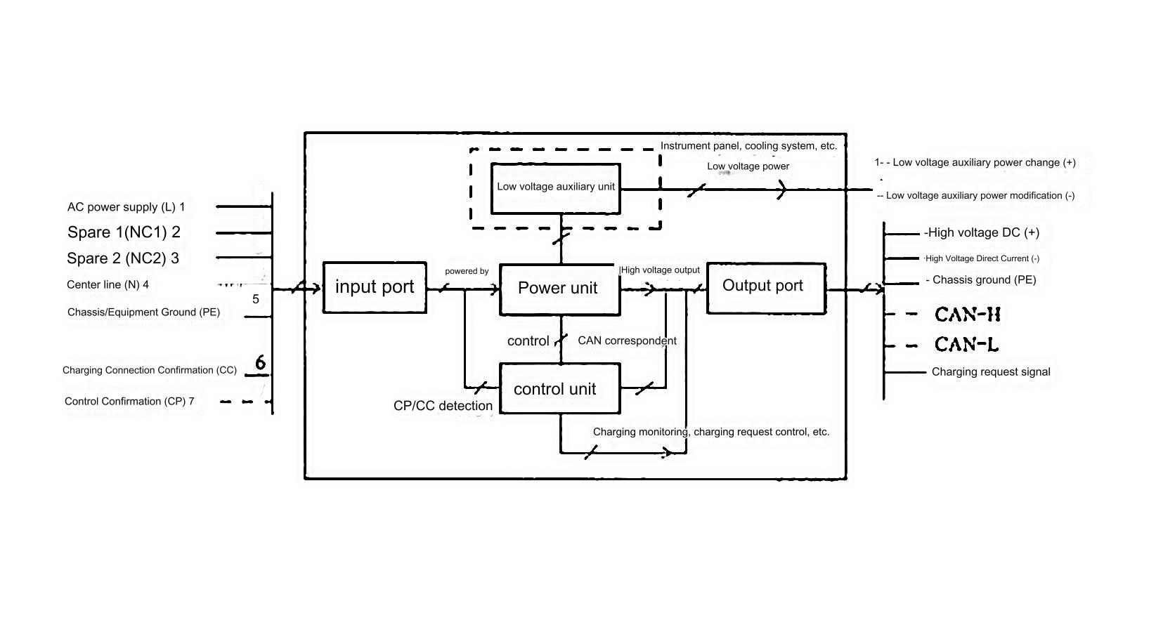 The output port includes two pin ports for the positive and negative poles of the low-voltage auxiliary power supply, two pin ports for the positive and negative poles of the high-voltage DC output and the chassis ground, CAN communication H and L and charging request signal lines.