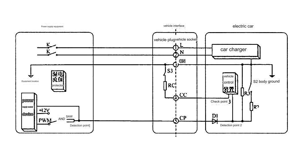As shown in the figure, when the switch S1 is closed, the PWM generator on the power supply device sends a modulated pulse signal, and the VCU checks whether the detection point 2 receives the PWM signal. If there is a signal, it means that the charging device is connected.